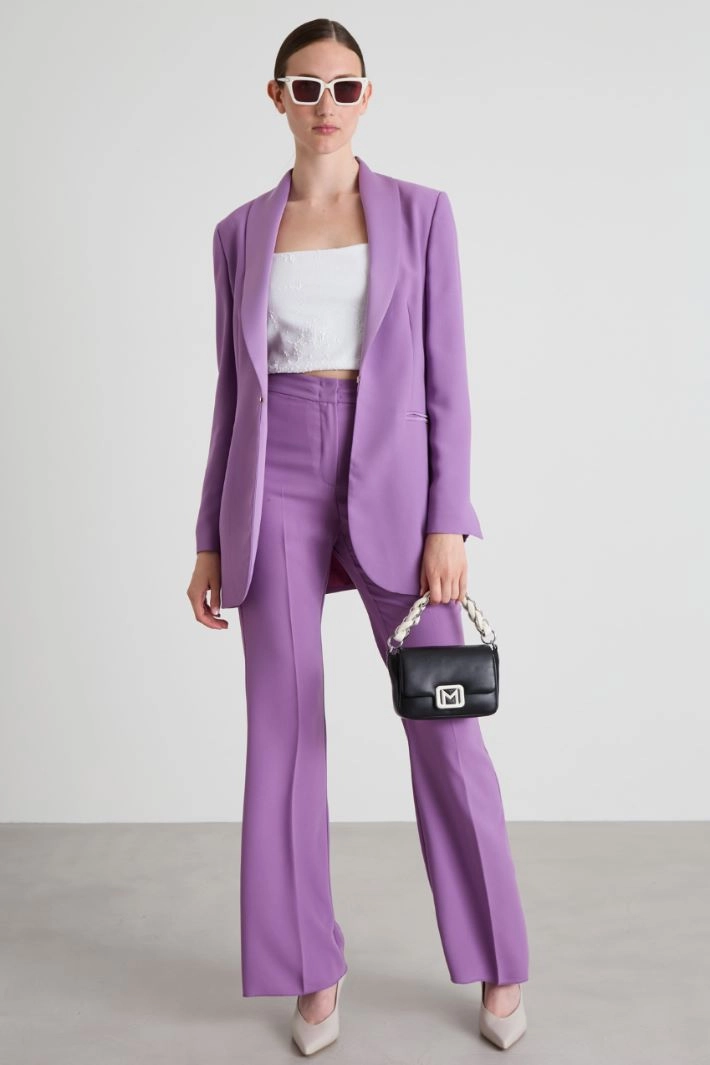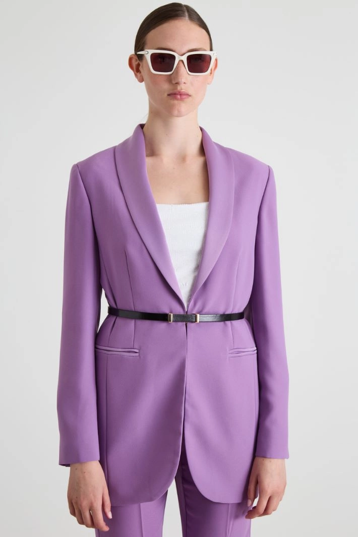 Straight-fit blazer in envers satin, with a glossy finish lapel collar, long sleeves with slit and double-welt side pockets. Single-breasted fastening with hook and matching faux leather belt. Lined.
