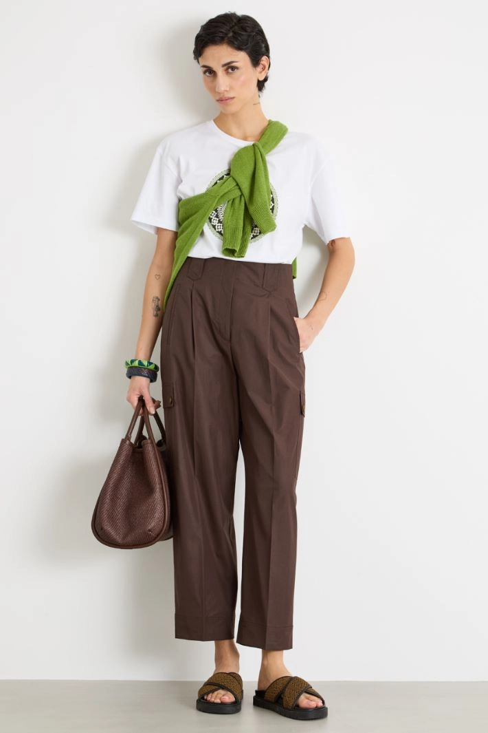 Straight-fit trousers in cotton poplin, featuring belt loops, pleats, front welt pockets and patch pockets on the legs. Concealed hook and zip fastening.