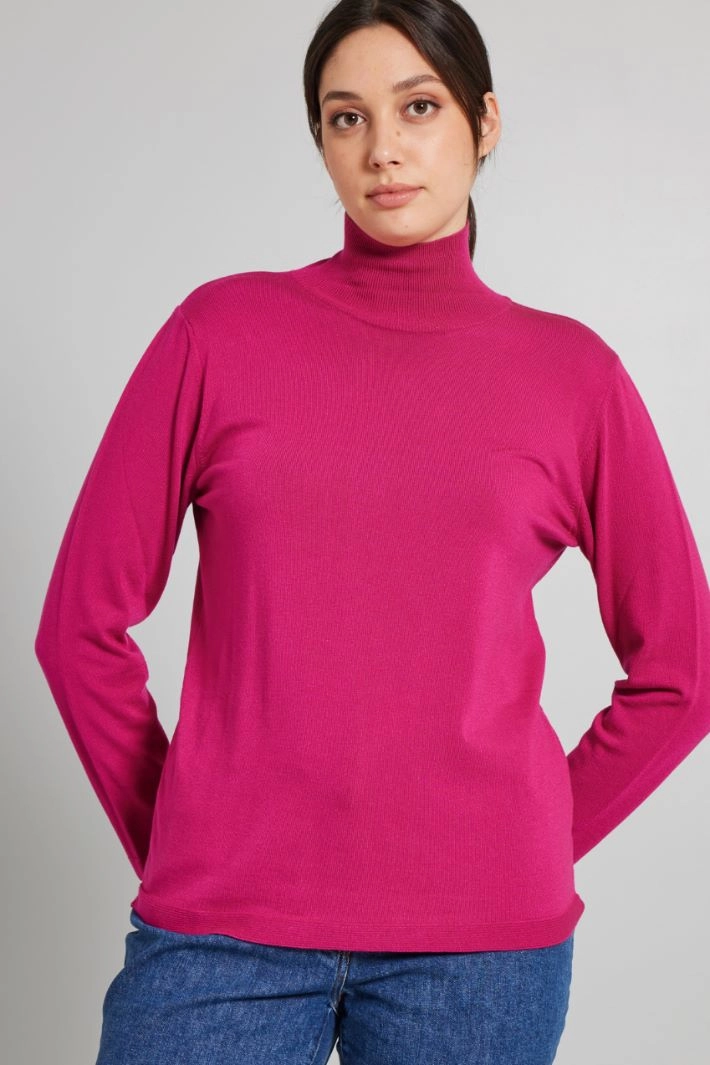 Semi-fitted sweater in stretch viscose blend yarn, with high neck, long sleeves and horizontal ribbed profiles.