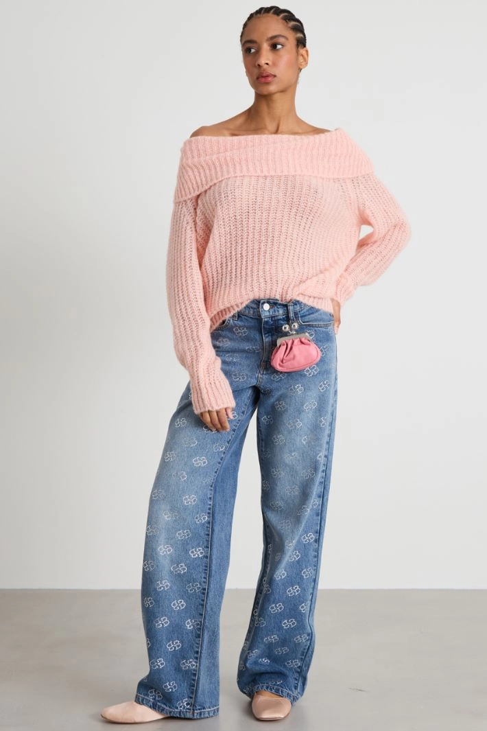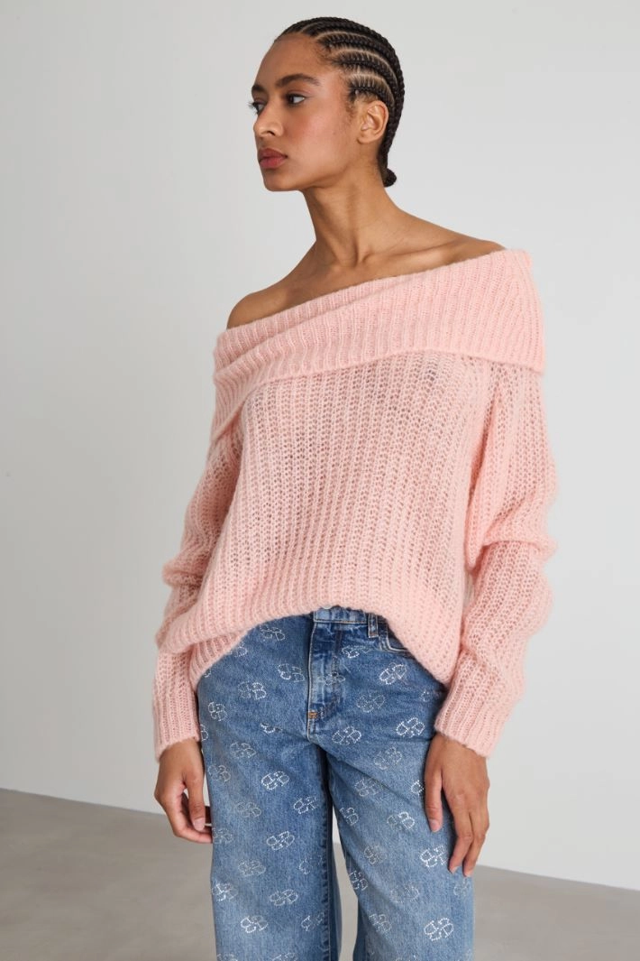 Regular-fit sweater in mohair blend yarn, with maxi turn-up collar and long sleeves.