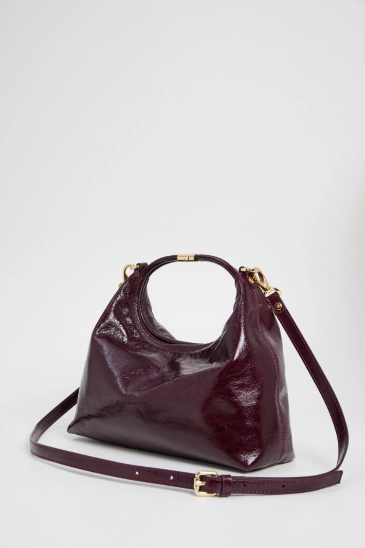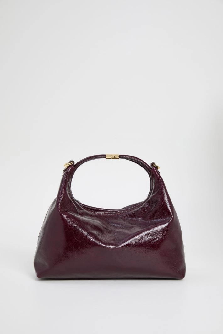 Bag in genuine leather with a shiny aged effect, with a single handle and an adjustable and removable shoulder strap. Magnetic button closure. Lined.