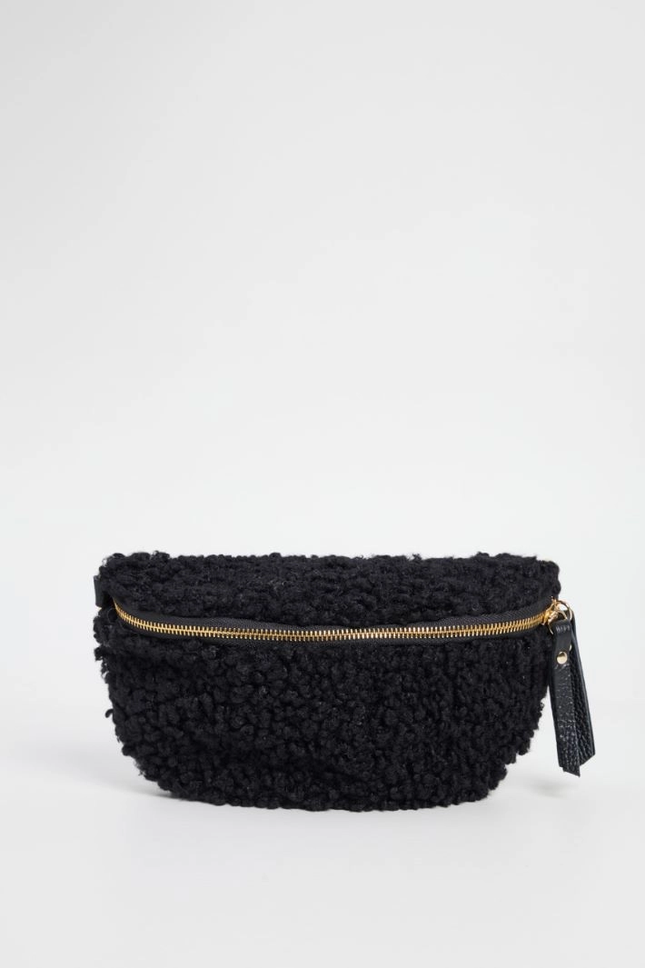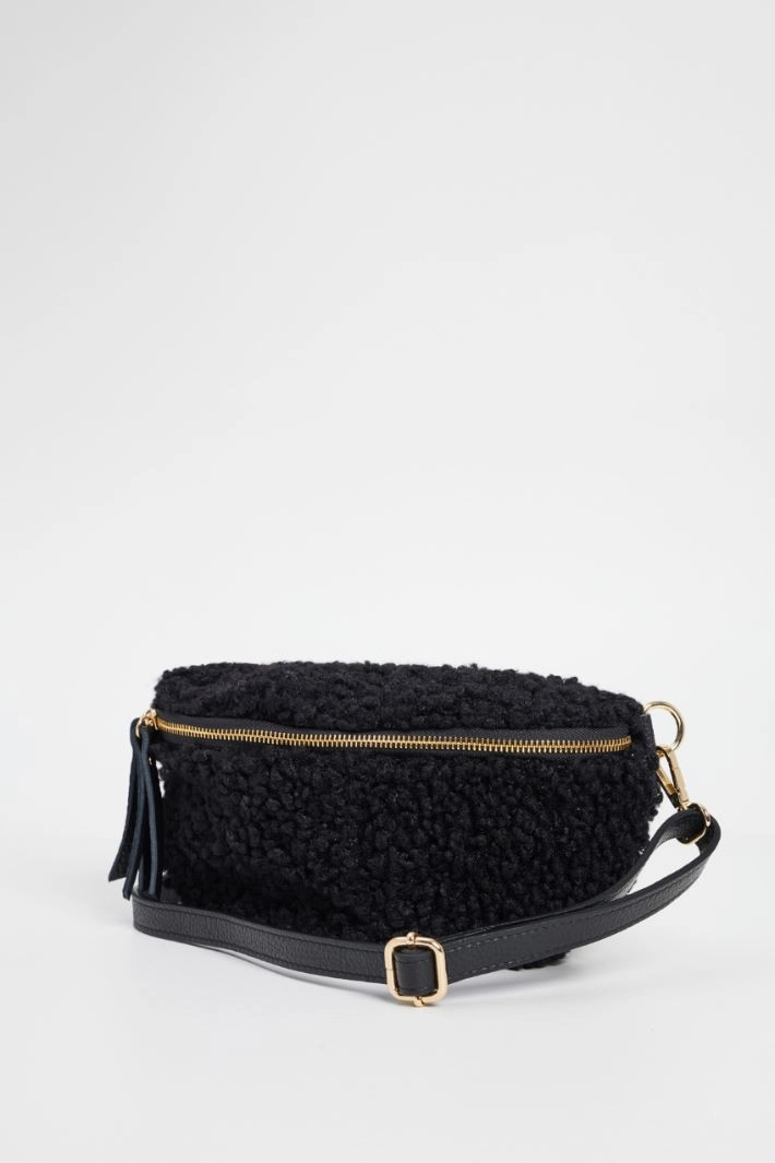 Pouch in plush fabric with removable and adjustable shoulder strap. Double slider zip closure with tassel detail.