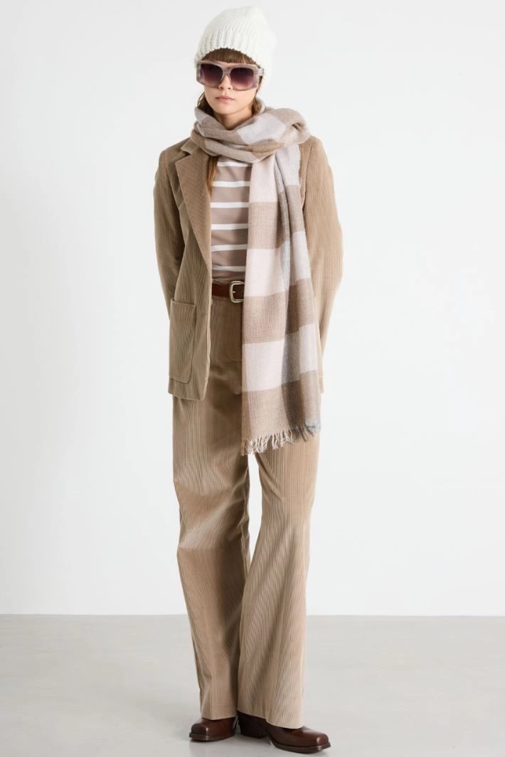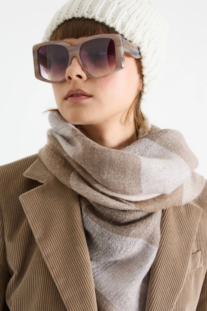 Stole in warm yarn-dyed wool and viscose blend. Fringed hem.