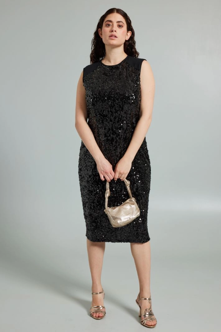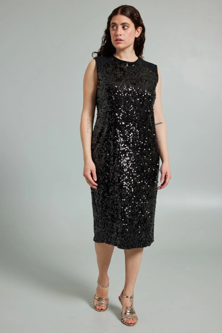 Sleeveless sheath jersey dress with all-over embroidered sequins, crew neckline and diagonal pattern on the shoulders. Slit at the bottom of the head. Invisible zip fastening on the back. Lined.
