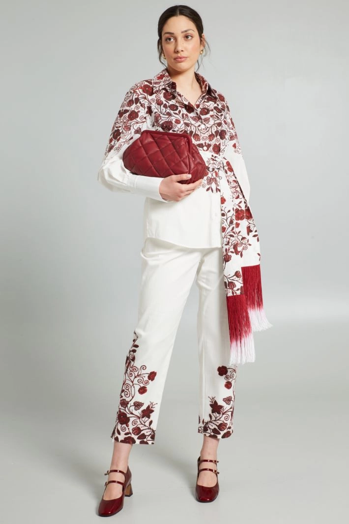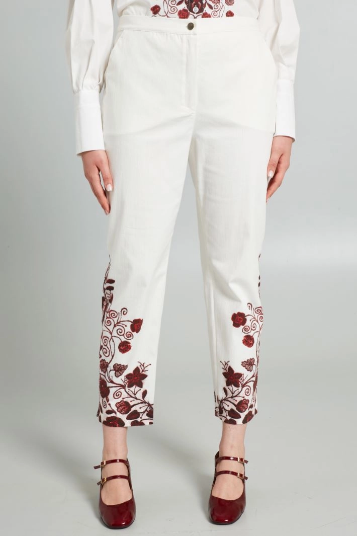Straight-cut trousers in printed cotton gabardine, with waistband, French pockets on the sides and welt pockets on the back. Zip and button fastening.