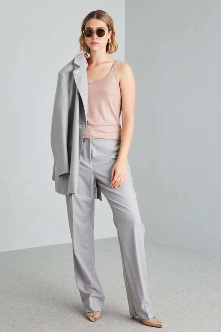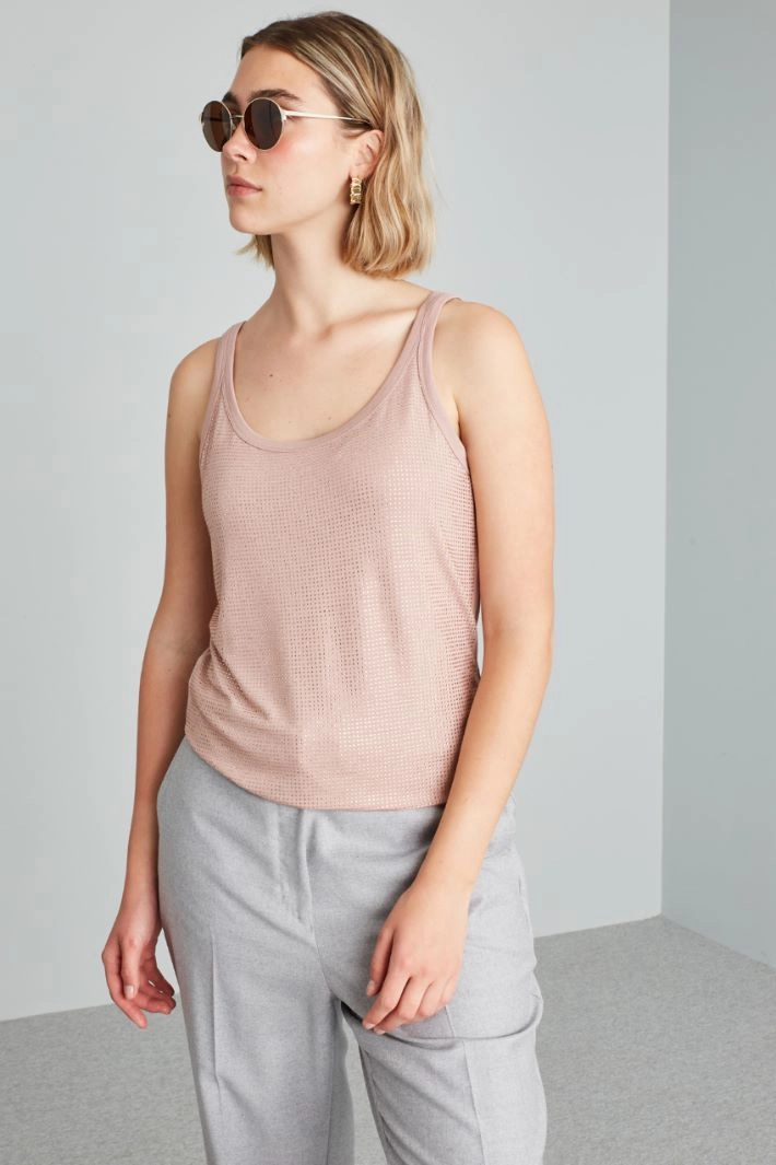 Top in viscose jersey embellished with rhinestones, U-neck, thin shoulder straps and fitted line.