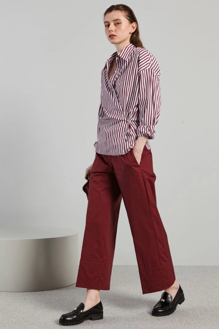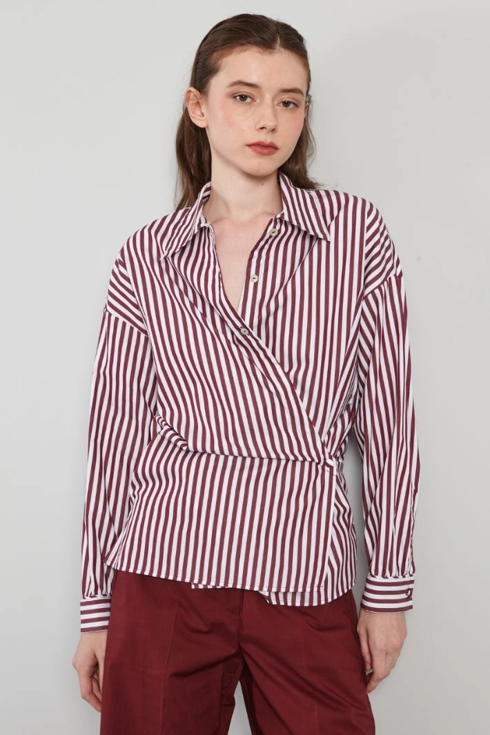 Loose-fitting shirt in pure yarn-dyed cotton poplin, with classic collar, long sleeves with dropped cuffs and buttons, yoke cut on the back and crossed wrap fastening with buttons.