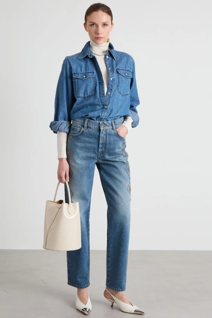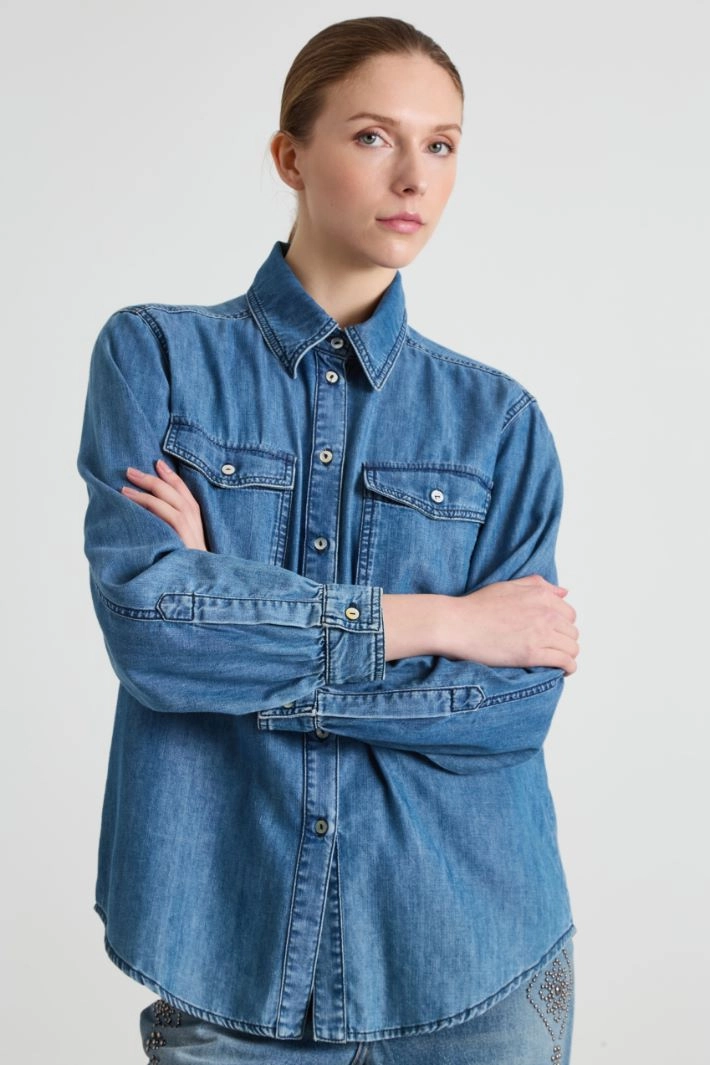 Oversized straight-fit shirt in cotton-blend denim, with classic collar, buttoned cuffed sleeves, and patch pockets with flaps on the chest. Rounded hem. Button fastening with visible buttons.