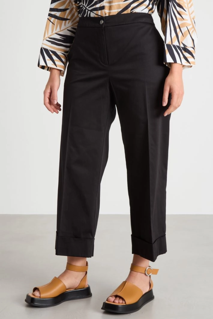 Straight-fit cropped trousers in stretch cotton satin, featuring French pockets on the front and darts at the back. Concealed button and zip fastening.