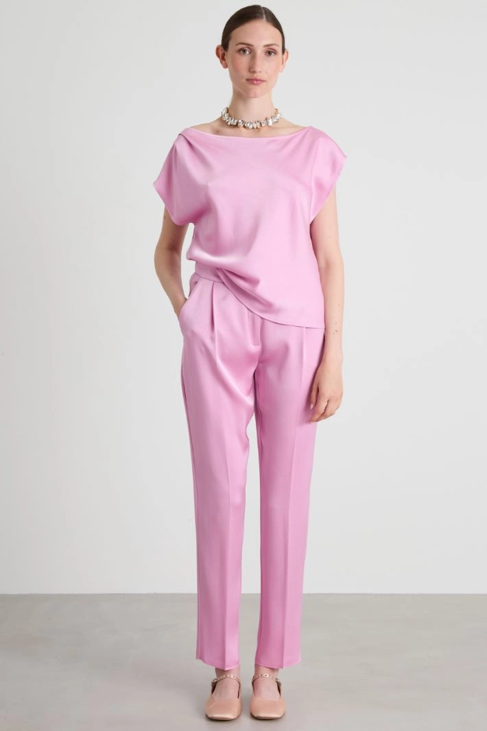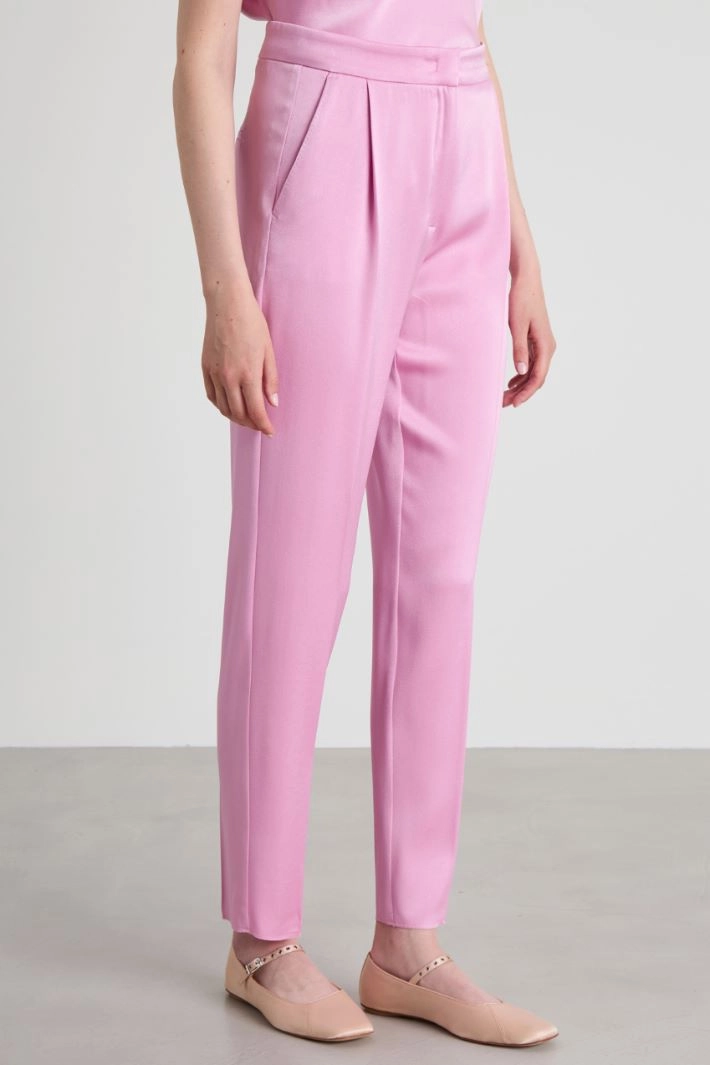 Cigarette trousers in envers satin with a shiny finish, with a sartorial finish, darts, side French pockets and welt pockets on the back, crease pressed lengthwise and hidden fastening with zip, button and hook.