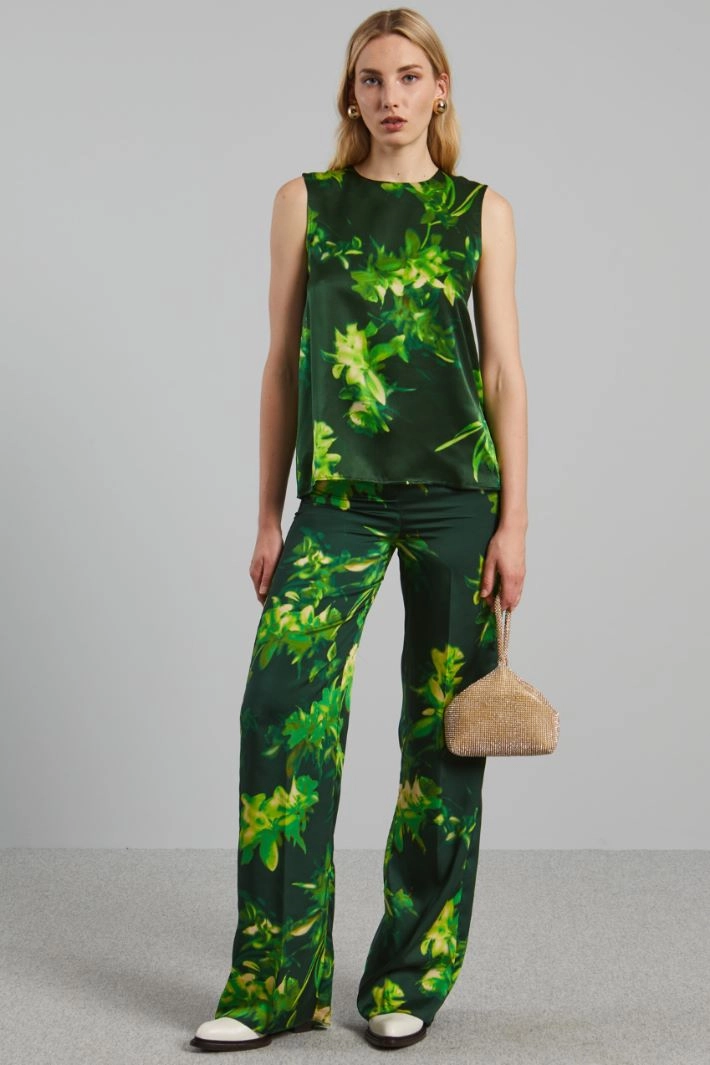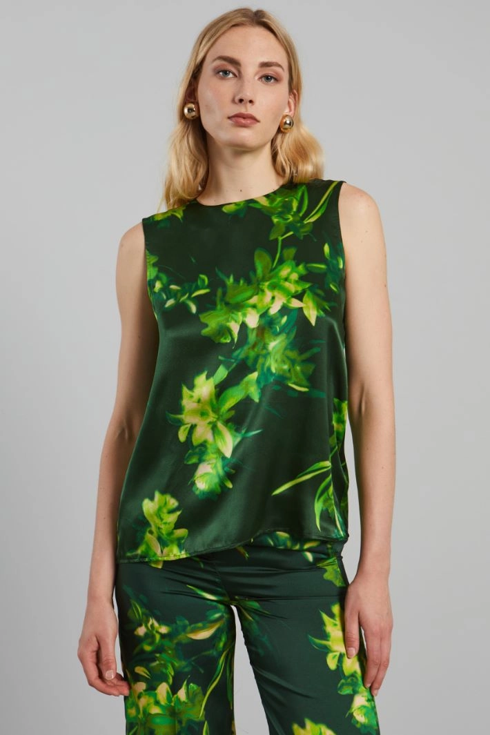 Fluid top in all-over printed pure silk satin, with round neckline, sleeveless and keyhole fastening with button on the back.