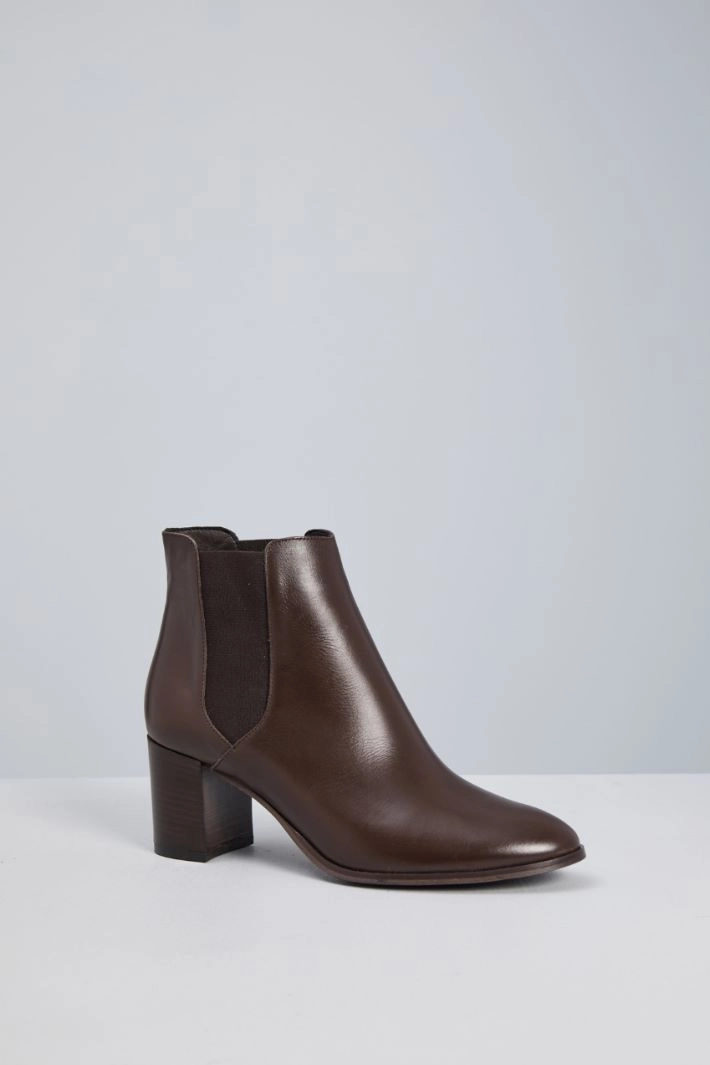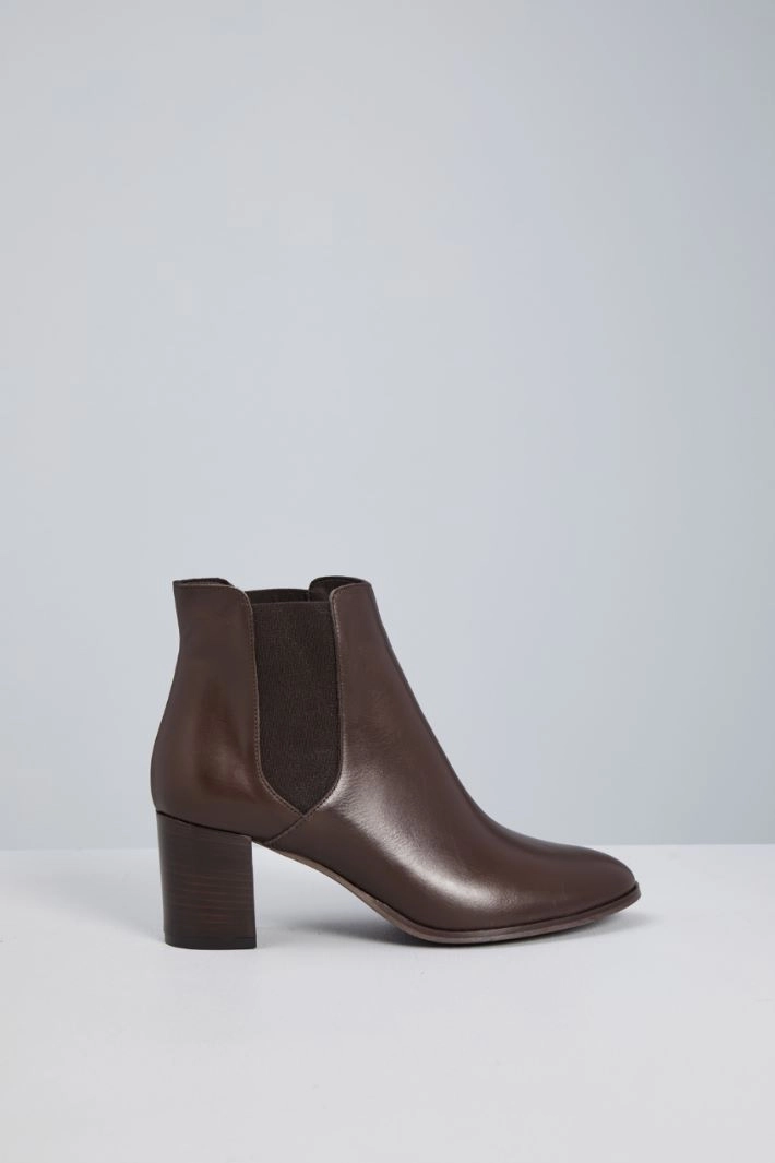 Ankle boots in real leather, with rounded toe, wood-effect block heel and elastic inserts on the sides. Rubber sole.