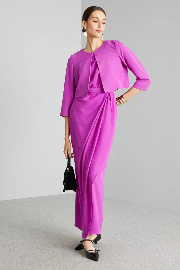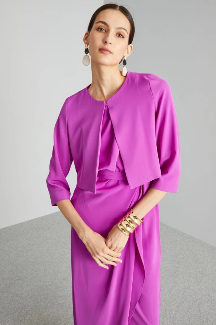 Straight-cut bolero in fluid stretch cady, with round neckline, three-quarter sleeves and hook fastening. Unlined.