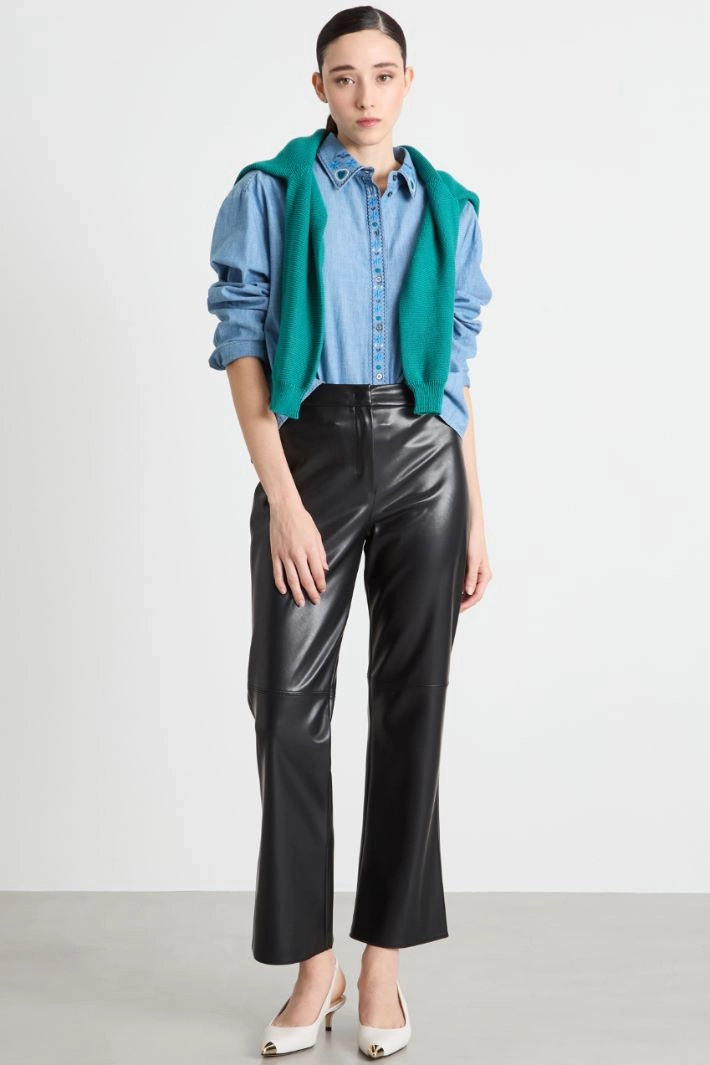 Straight-cut denim shirt with an embroidered point collar and placket, long dropped-shoulder sleeves, buttoned cuffs and a patch pocket on the chest. Finished with a rounded hem and a yoke on the back. Concealed button fastening.