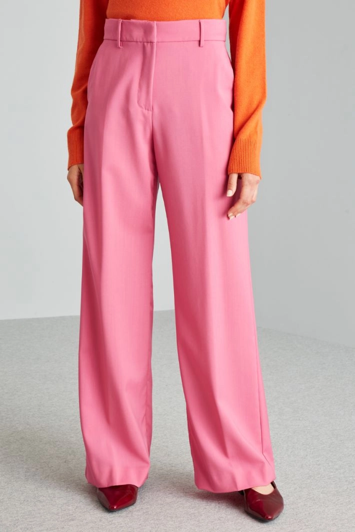 Wide, straight-cut trousers in pure wool canvas, with belt and belt loops at the waist, French pockets at the front and welt pockets with button at the back. Hidden fastening with zip, button and hook.
