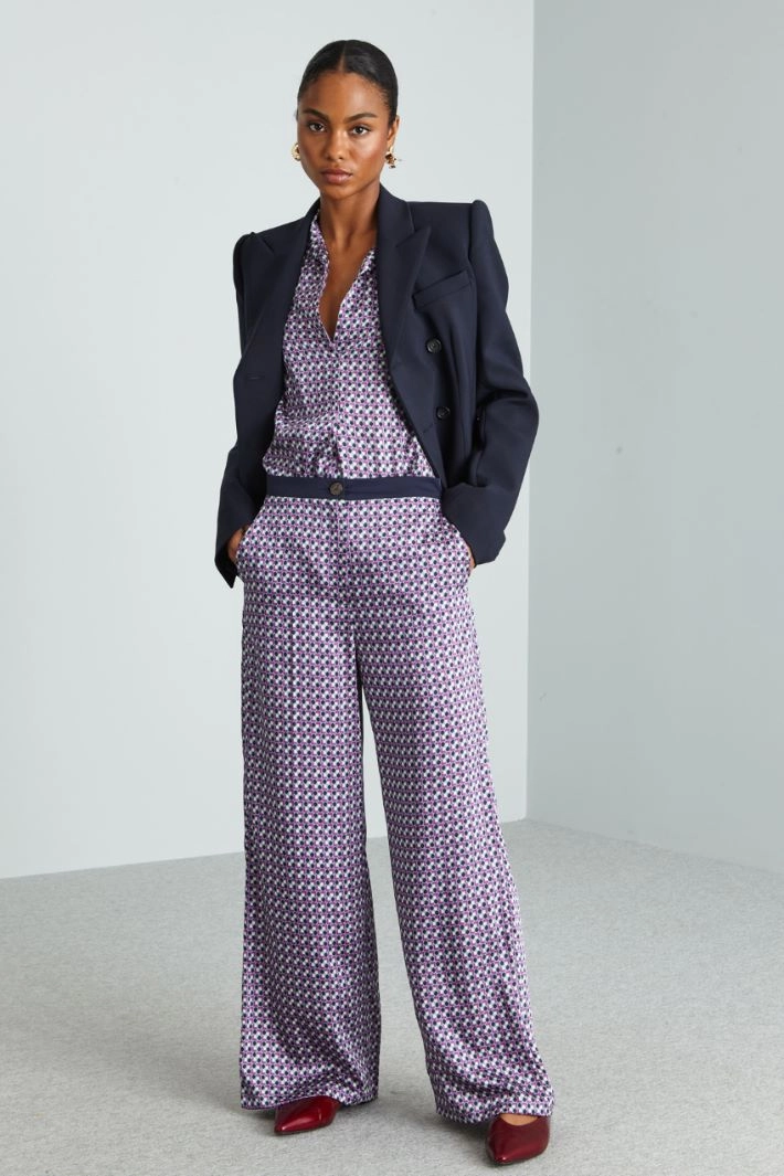 Loose-fit trousers in printed twill, with waistband, side French pockets and fastening with hidden zip and button.