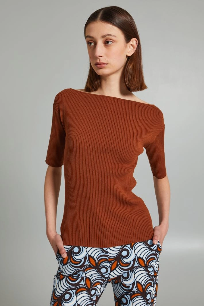 Slim-fit sweater in ribbed stretch viscose blend yarn, with boat neckline and short sleeves.