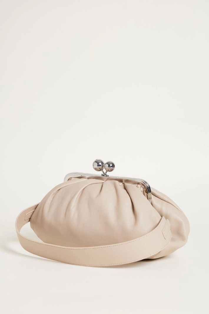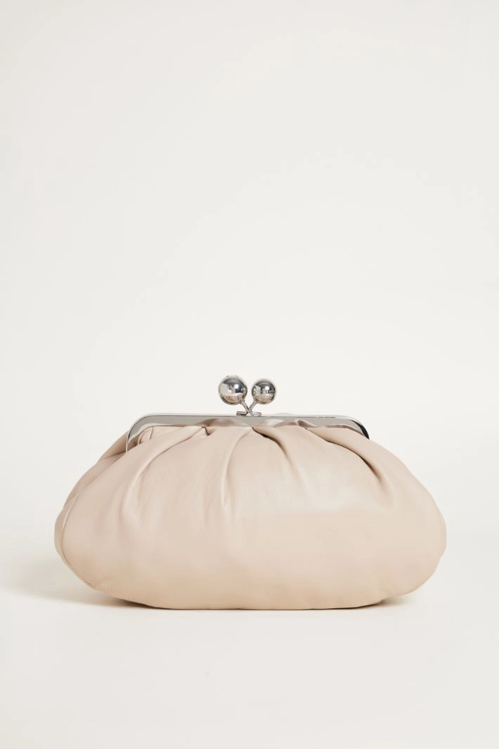 Nappa leather clutch bag featuring two removable shoulder straps, a twill-lined interior with a pocket, and a clasp fastening with spheres.