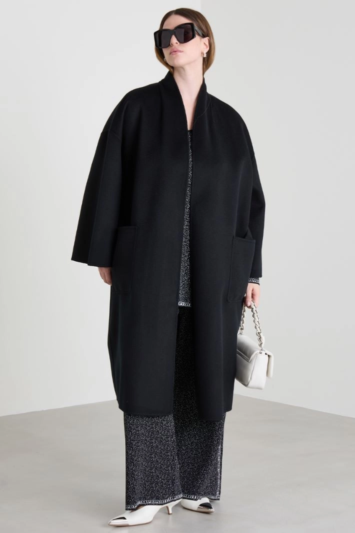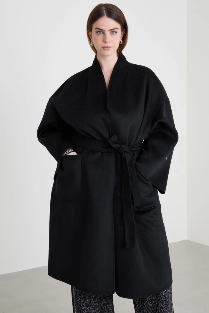 Straight-fit coat in double pure wool sable fabric, with shawl collar, long dropped sleeves, side patch pockets and fastening with a matching belt. Unlined.