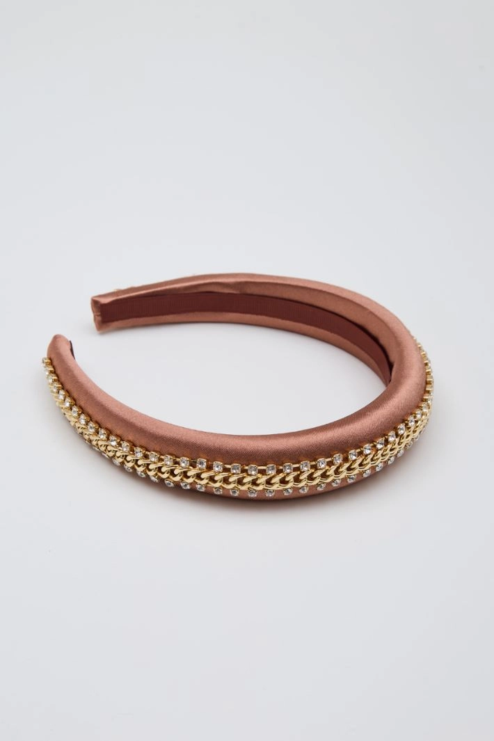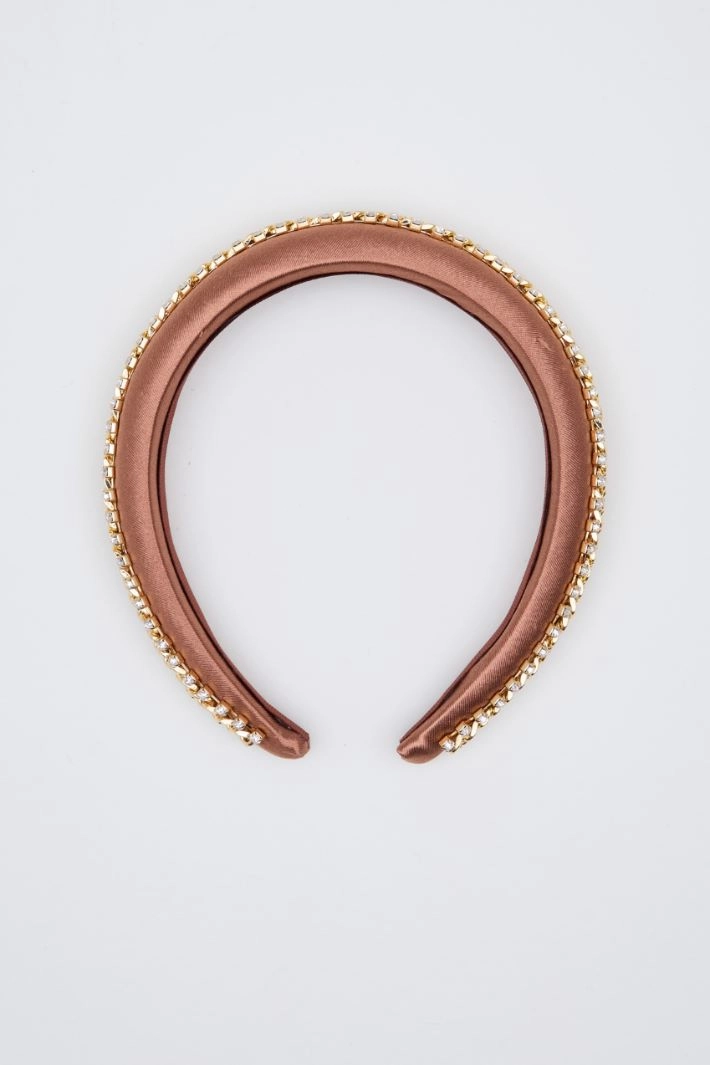 Headband in padded satin with rhinestone motif.