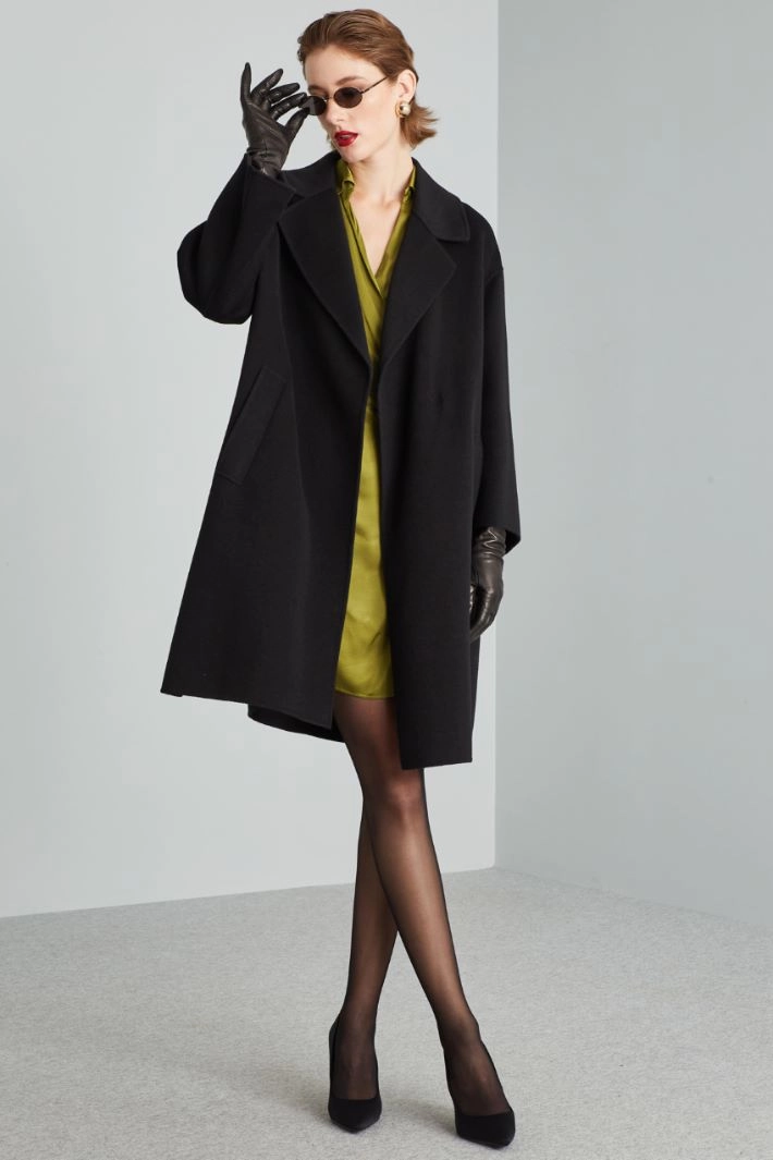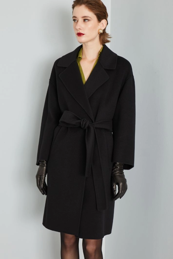 Straight-cut coat in double wool cloth, with lapel collar, long sleeves, side welt pockets and central vent on the back. Fastening with matching belt. Unlined.