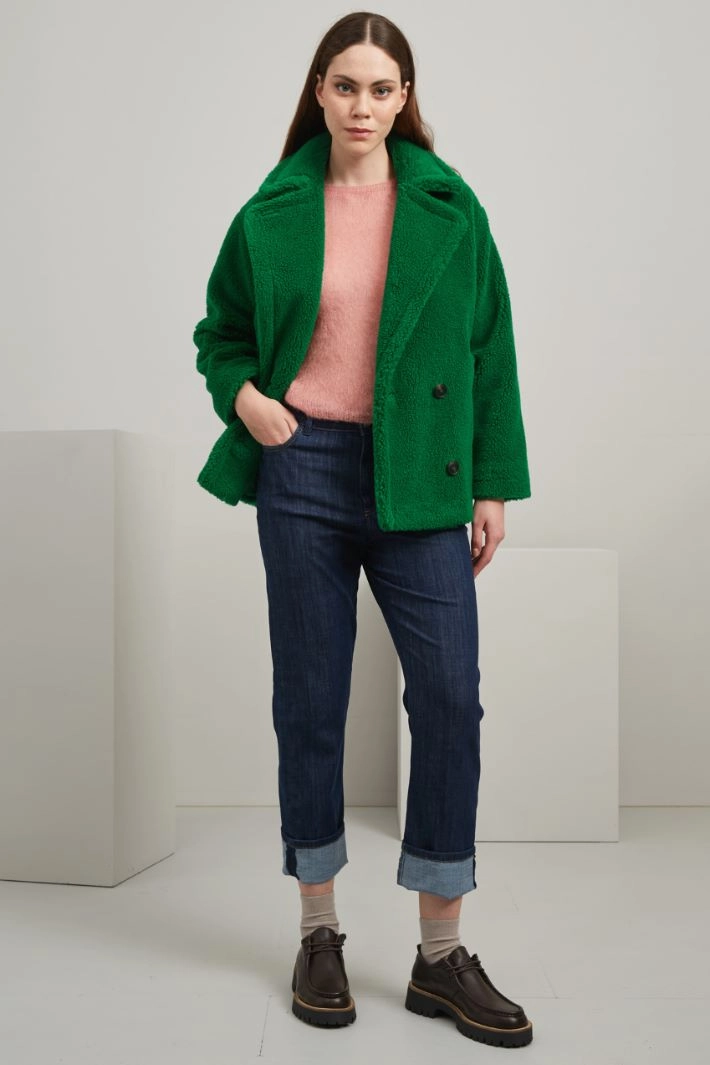 Straight cut jeans in stretch cotton denim with five pockets, covered zip and button fastening.