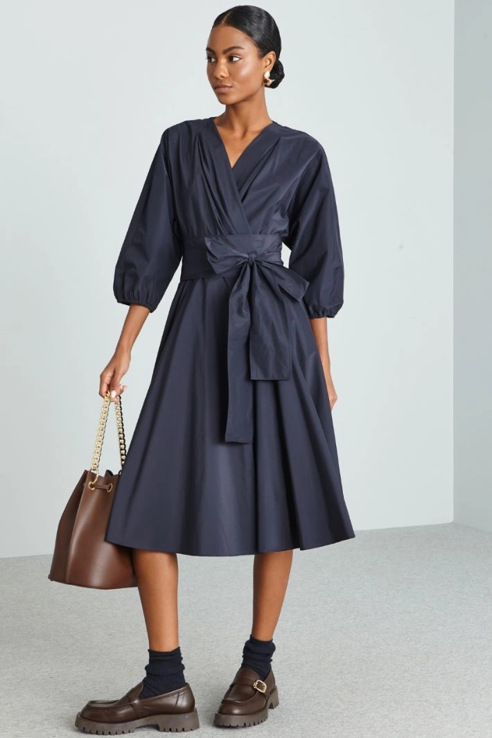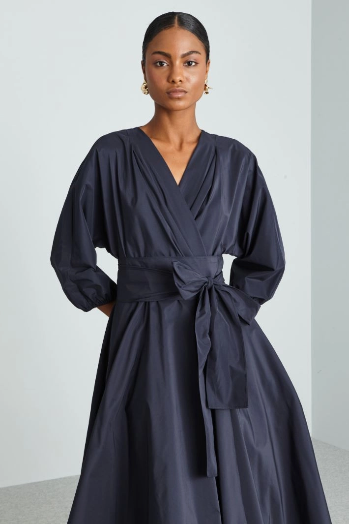 Wrap-style midi dress in cotton blend taffeta. The model has a crossed V-neck with drapes, three-quarter kimono sleeves with elastic insert and side pockets inserted in the seams. Fastening with sash to tie at the waist.