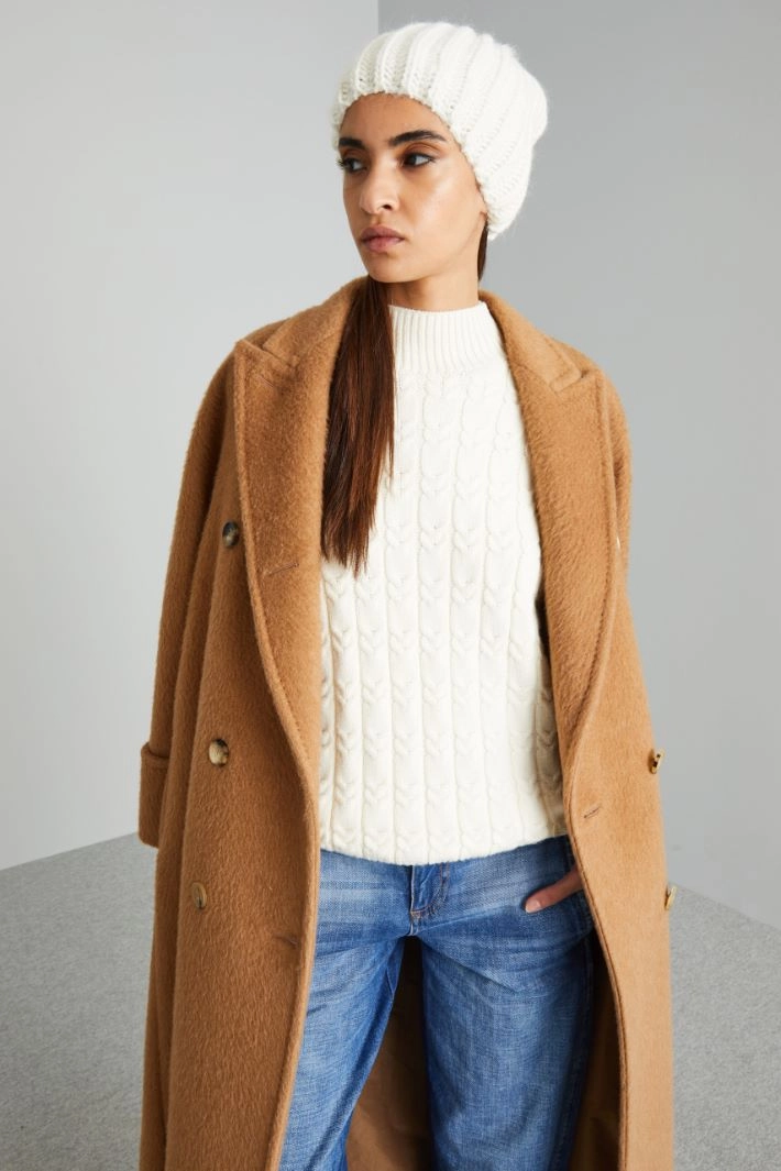 Fabric 60% acrylic, 15% wool, 15% alpaca, 10% viscose; with details in 93% acrylic, 7% polyester.