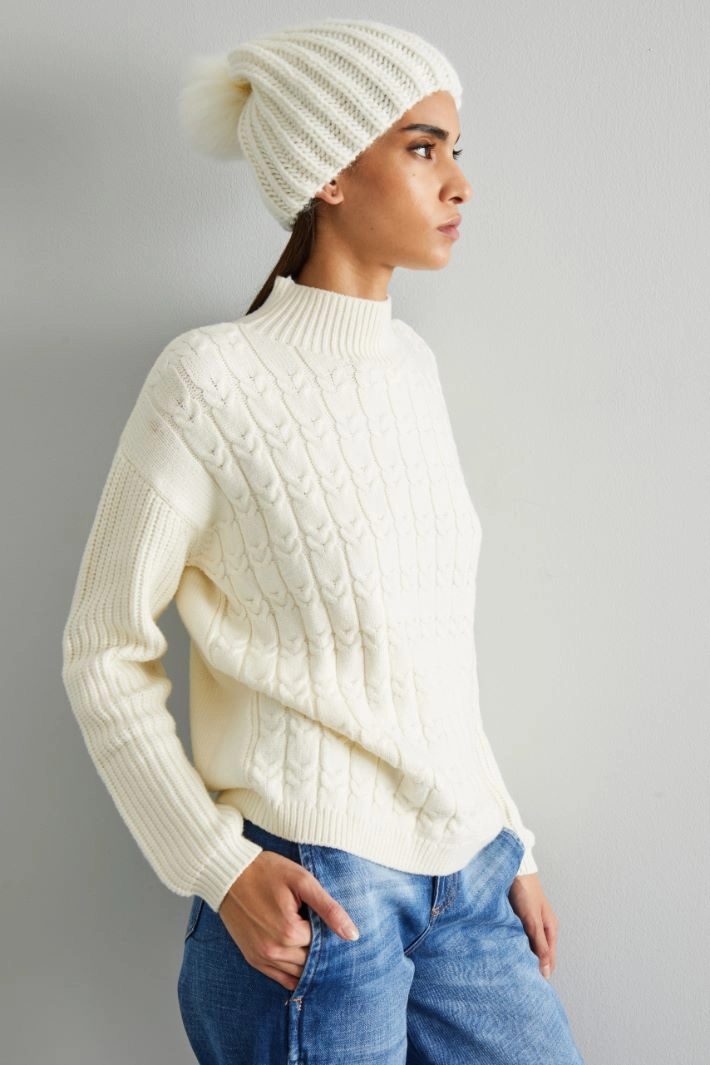Beanie hat in wool, viscose and alpaca blend yarn with ribbed knit and pom pom on top.