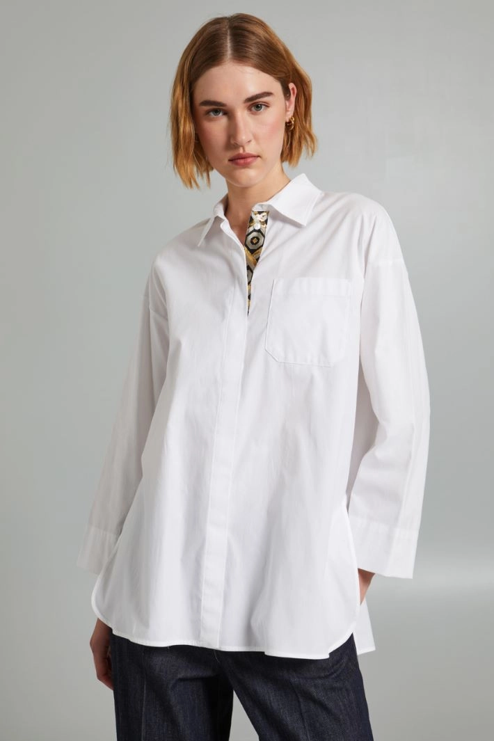 Straight-fit shirt in pure cotton Oxford, with classic collar, embroidered ribbon detail, long sleeves with high cuffs, patch pocket on the chest and side slits at the hem. Yoke and pleat on the back. Hidden button fastening.